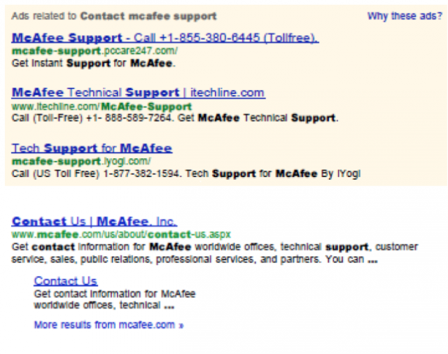 But PCCare247 went further, taking out ads on search terms like âmcafee phone number usa,â ânorton customer service,â and âdell number for help.â The ads themselves said things like âMcAfee Support - Call +1-855-[redacted US phone number]â and pointed to domains like mcafee-support.pccare247.com. As numerous complaints attest, less savvy computer users searching the Internet for specific tech support phone numbers would see PCCare247âs number near the top of their screens and assume that this was an official line.